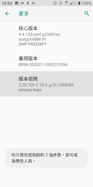 5 連續點擊 "版本號碼" 約7、8次,途中會出現如圖下方提示出現 "你只需完成剩餘的x個步驟,即可成為開發人員。" ,提示出現時請不要停止點擊,如果有設定PIN碼的話,點擊完成後會要你輸入PIN碼。